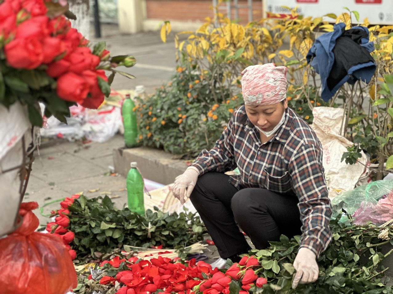 Người phụ nữ bán hoa tươi trên phố này tất bật từ sáng sớm vì đông khách.