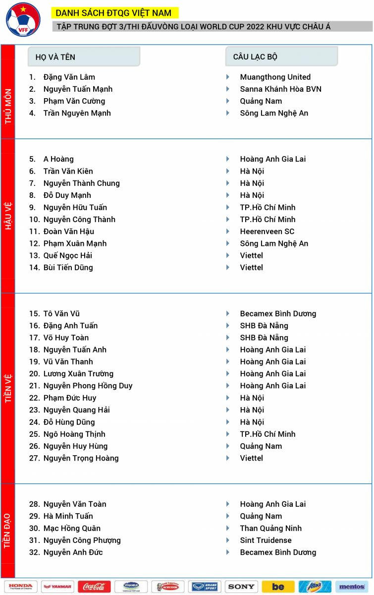 Trước đó, HLV Park Hang-seo công bố danh sách triệu tập hơn 30 cầu thủ để chuẩn bị cho 2 trận đấu quan trọng trên, trong đó đáng chú ý là sự góp mặt trở lại của những cái tên từng rất quen thuộc trong màu áo ĐT Việt Nam trước đây như Võ Huy Toàn (SHB Đà Nẵng), Mạc Hồng Quân (Than Quảng Ninh) hay Ngô Hoàng Thịnh (TP HCM).