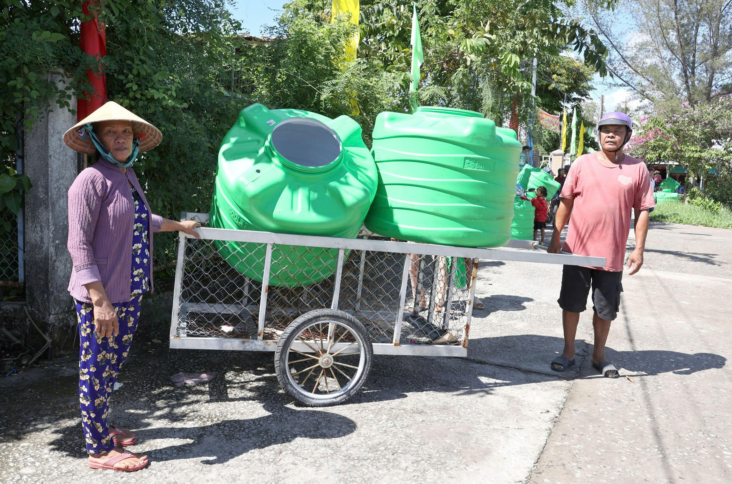 Người dân xã Nam Thái vui mừng khi nhận được bồn nước từ nhà tài trợ |
