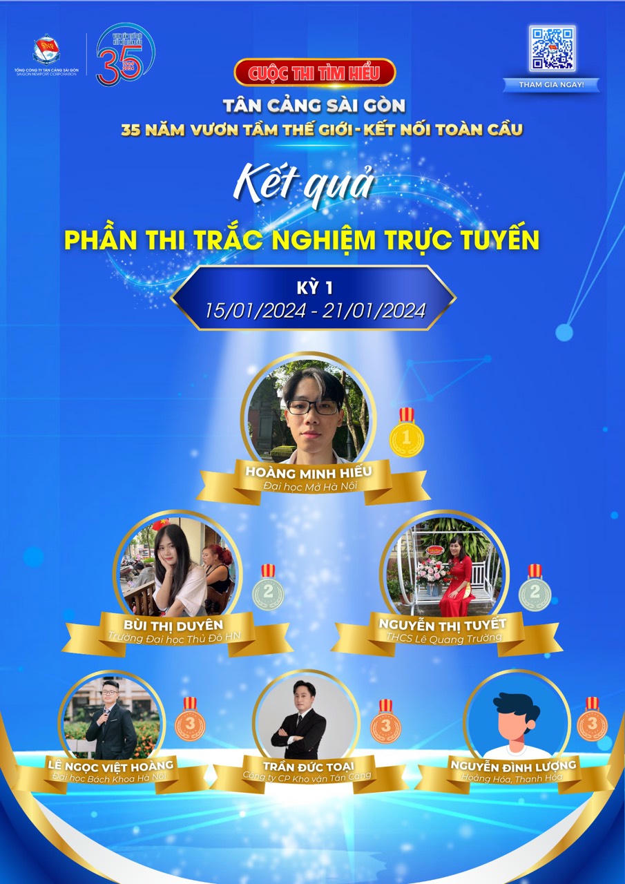Kỳ thi thứ hai - Cuộc thi tìm hiểu “Tân Cảng Sài Gòn 35 năm vươn tầm thế giới - kết nối toàn cầu (15/3/1989 - 15/3/2024) với chủ đề chủ đề: “Bước chuyển mình trở thành doanh nghiệp khai thác cảng số 1 Việt Nam” sẽ bắt đầu từ 8 giờ ngày 22 đến 16 giờ ngày 28/01 theo đường link: https://www.cuocthisnp.com/