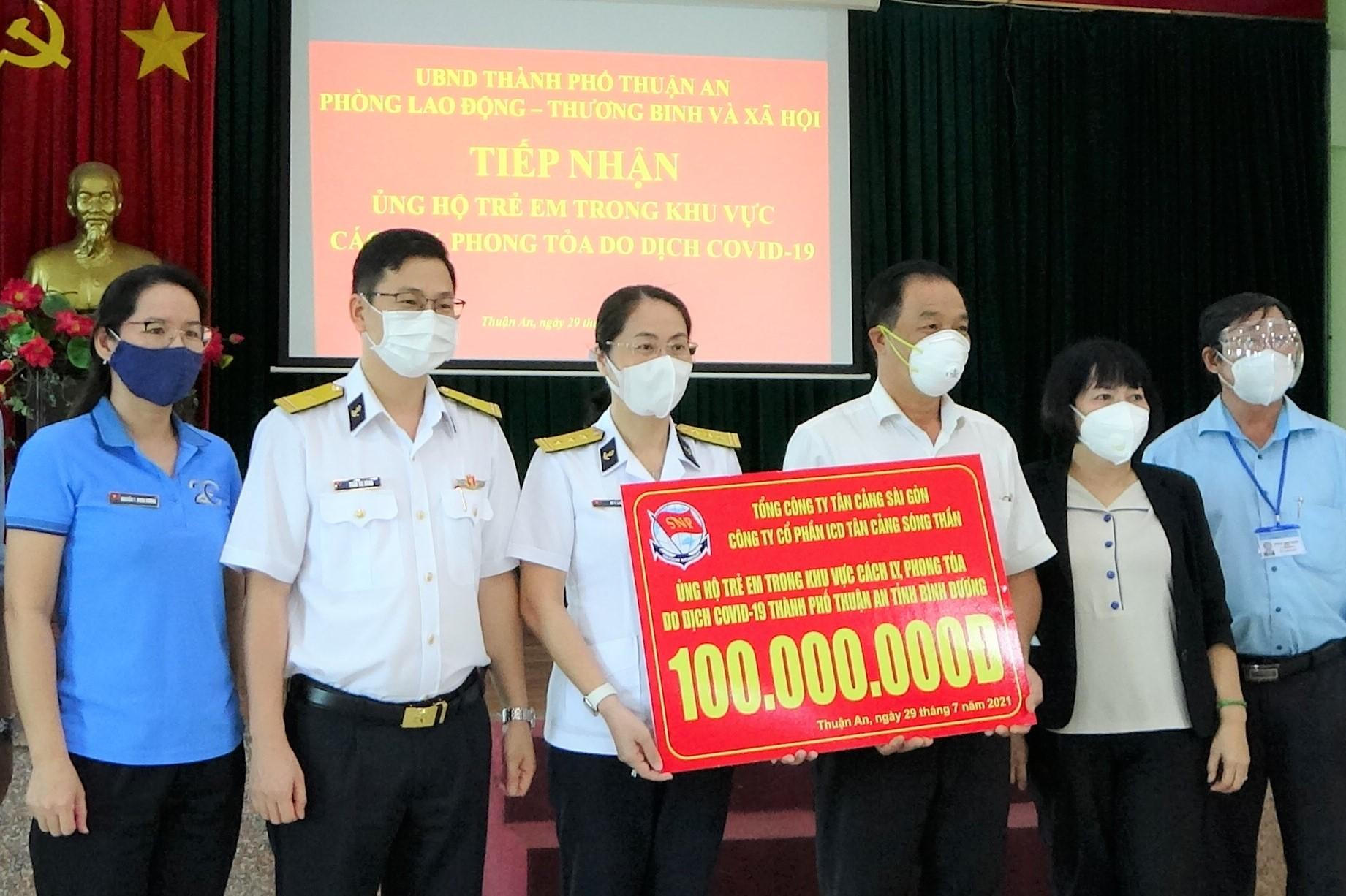 Chia sẻ với những khó khăn, vất vả trong công tác phòng, chống dịch của địa phương, Tân cảng Sóng Thần đã trích 100 triệu đồng để hỗ trợ kinh phí chăm lo cho các em thiếu nhi tại khu vực cách ly và phong tỏa do dịch Covid-19 trên địa bàn.