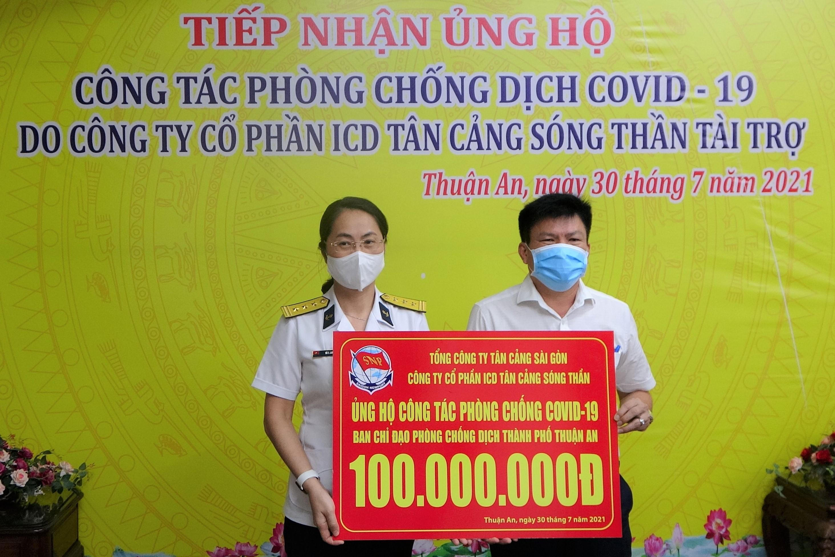 Để kịp thời động viên và hỗ trợ thêm nguồn kinh phí phục vụ công tác phòng, chống dịch, Tân cảng Sóng Thần đã trích 350 triệu đồng để chia sẻ với địa phương. Trong đó, Tân cảng Sóng Thần ủng hộ 200 triệu đồng cho Quỹ phòng, chống dịch COVID-19 thành phố Thuận An; ủng hộ 100 triệu cho công tác phòng chống dịch thành phố Thuận An và ủng hộ 50 triệu đồng cho công tác phòng, chống dịch của phường Bình Hòa.
