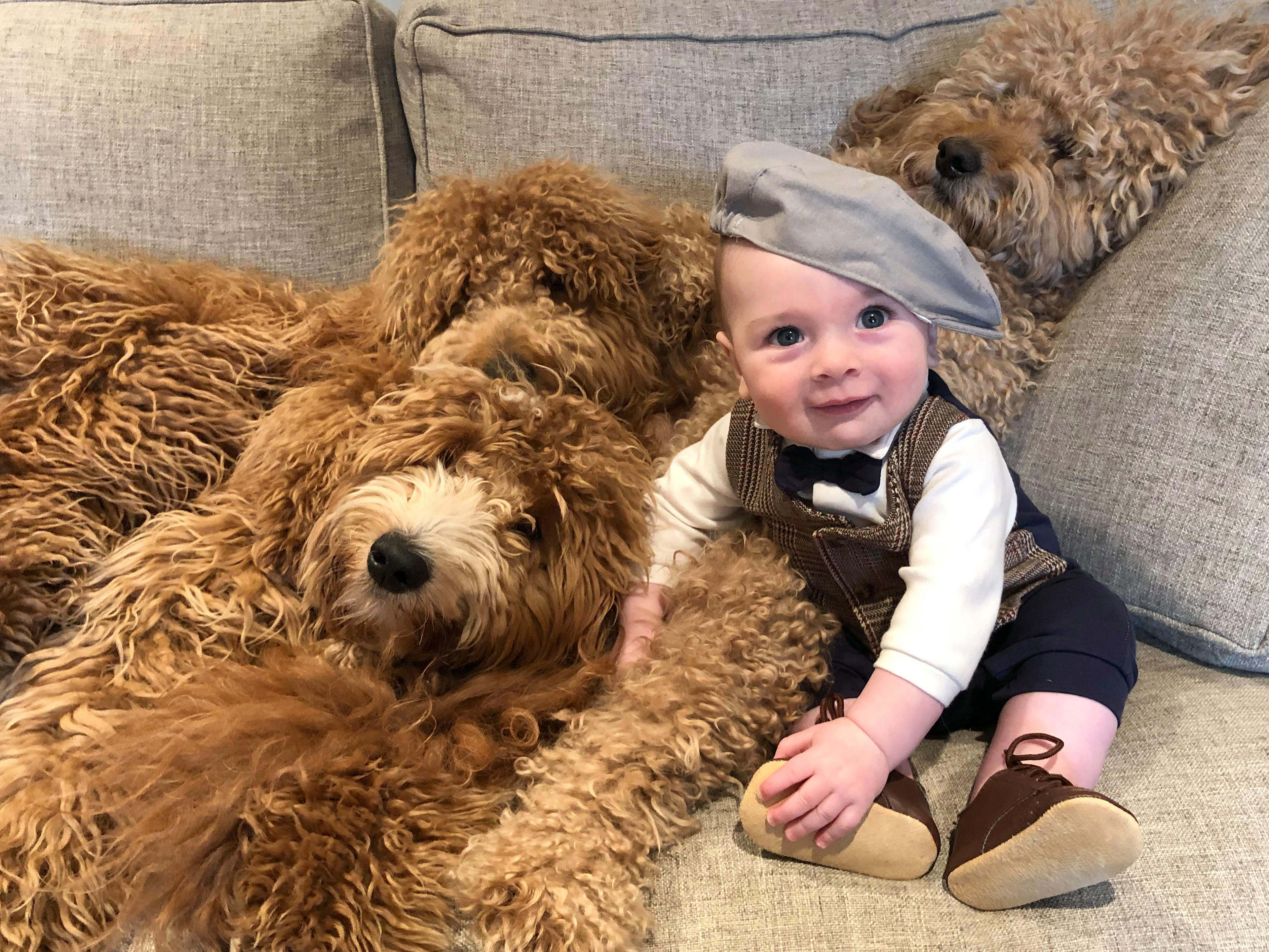 Bé tên Theo, 6 tháng tuổi, tạo dáng với các chú thú cưng - chó tha mồi vàng lai với chó xù.