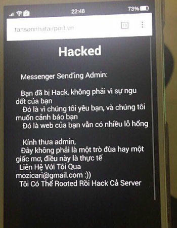 Trước đó, gần 23h ngày 8/3, trang web của sân bay Tân Sơn Nhất đột nhiên không truy cập được và xuất hiện dòng chữ cảnh báo hệ thống đã bị xâm nhập trên trang chủ. Đến 10h ngày 9/3, hệ thống web này đã được khôi phục.