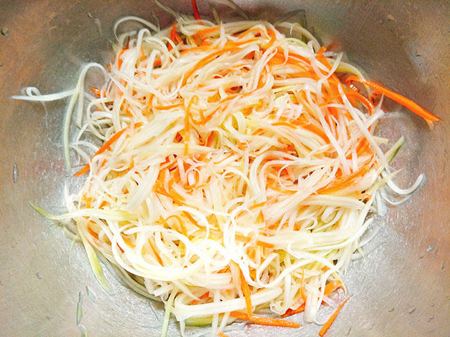 Bước 3: Đu đủ gọt sạch vỏ rồi nạo thành sợi, rửa thật sạch cho hết nhựa. Cà rốt cũng đem nạo sợi nhỏ.