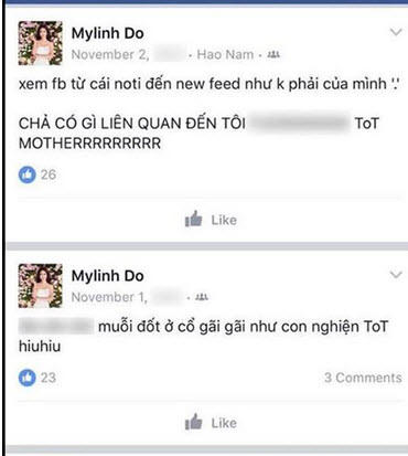 Những status chửi thề, có ngôn từ không đẹp được cô đăng tải trên trang Facebook cá nhân thời gian trước khi tham gia cuộc thi.