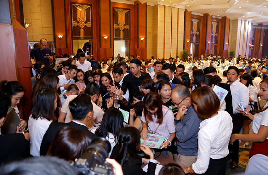 Ngay trong ngày đầu ra mắt, khu vực đăng ký giữ chỗ căn hộ đã kín khách hàng, các khu vực làm thủ tục luôn làm việc hết công suất