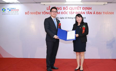 | Bà Nguyễn Thị Mai Phương – Chủ tịch HĐQT trao quyết định bổ nhiệm Tổng giám đốc Tập đoàn Tân Á Đại Thành cho ông Nguyễn Duy Chính |
