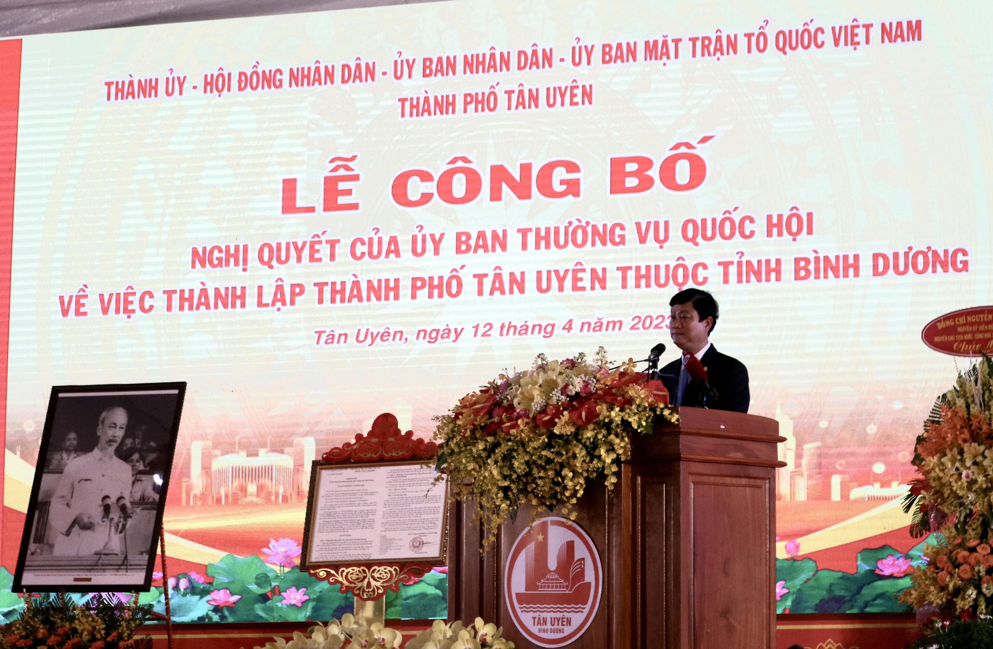 (PLVN) - Sáng 12/4, Thị xã Tân Uyên tổ chức Lễ công bố Nghị quyết của Ủy ban Thường vụ Quốc hội về việc thành lập thành phố (TP) Tân Uyên thuộc tỉnh Bình Dương.