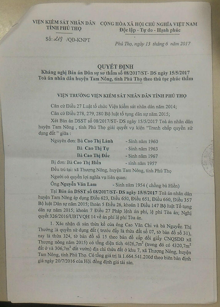Sau khi nghiên cứu Bản án sơ thẩm, cùng toàn bộ hồ sơ vụ án, ngày 13/6/2017, VKSND tỉnh Phú Thọ đã có Quyết định số 219/QĐ-KNPT kháng nghị đối với Bản án DSST số 08/2017/ST-DS của TAND huyện Tam Nông theo thủ tục phúc thẩm.