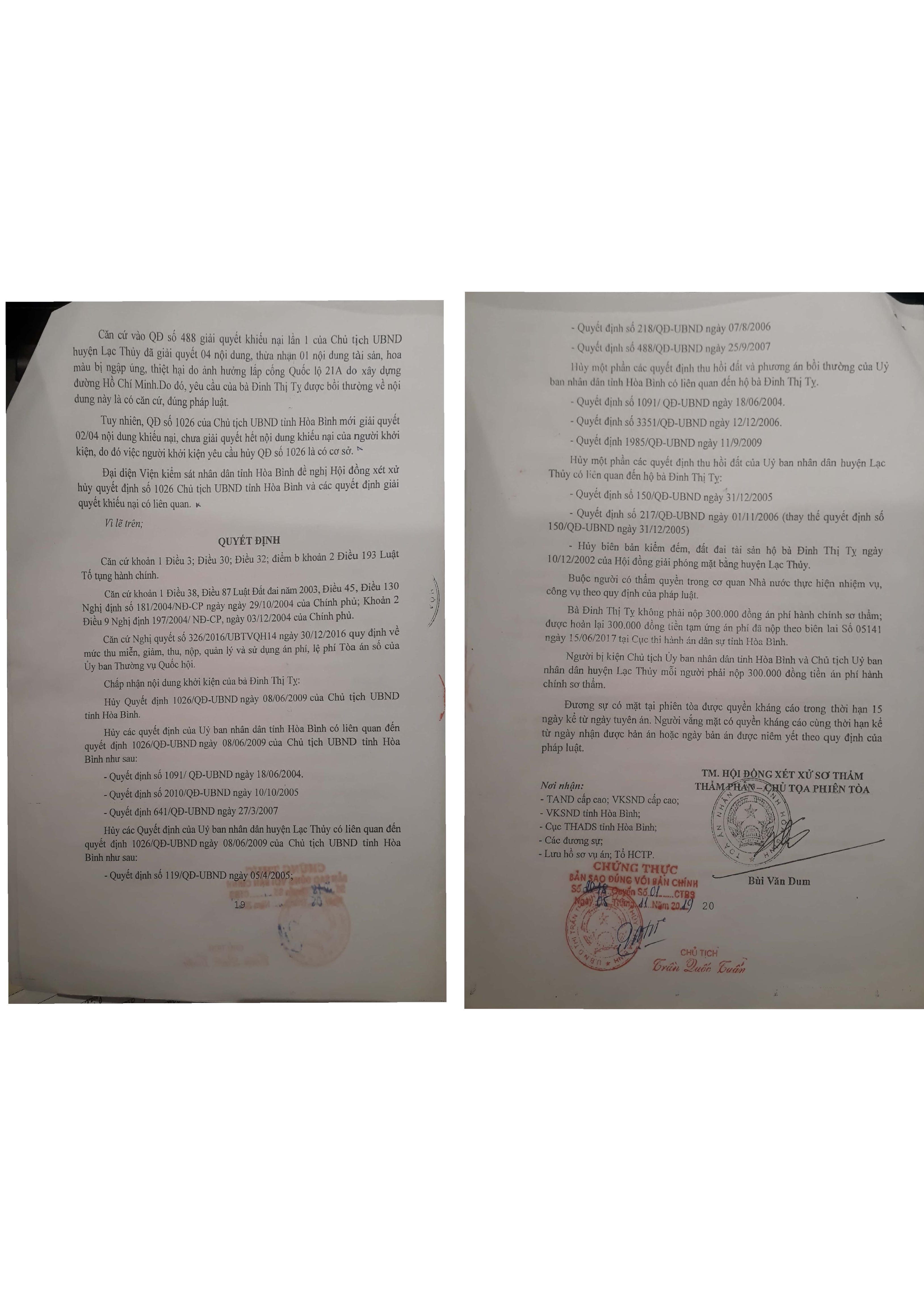 Không chỉ dừng lại ở đó, TAND tỉnh Hòa Bình cũng đã tuyên hủy 3 quyết định của UBND huyện Lạc Thủy có liên quan đến QĐ 1026/QĐ-UBND. Cụ thể, TAND tỉnh Hòa Bình tuyên hủy Quyết định số 119/QĐ-UBND ngày 05/4/2005; Quyết định số 218/QĐ-UBND ngày 07/08/2006; Quyết định số 488/QĐ-UBND ngày 25/9/2007.