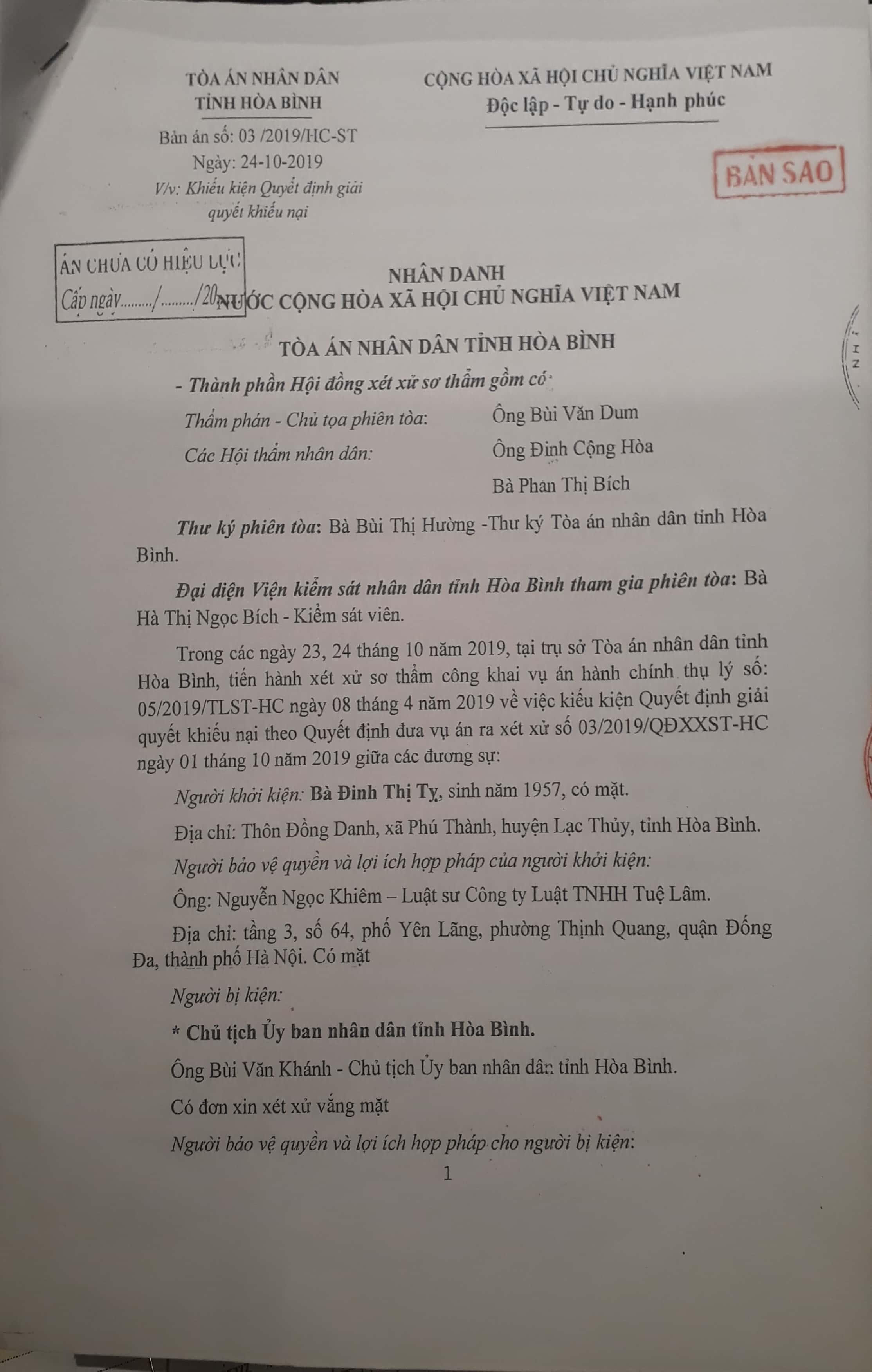 Phiên xét xử sơ thẩm vụ án hành chính lần 2 số 03/2019/HCST ngày 24/10/2019, TAND tỉnh Hòa Bình đã phần nào bù đắp được những tổn thất, mất mát về con người, tài sản, tinh thần và quyền lợi của gia đình bà Đinh Thị Tỵ. Bản án của TAND tỉnh Hòa Bình giúp cho gia đình bà Tỵ cũng như dư luận có thêm niềm tin vào những người “cầm cân nảy mực”, bảo vệ công lý, lẽ phải.