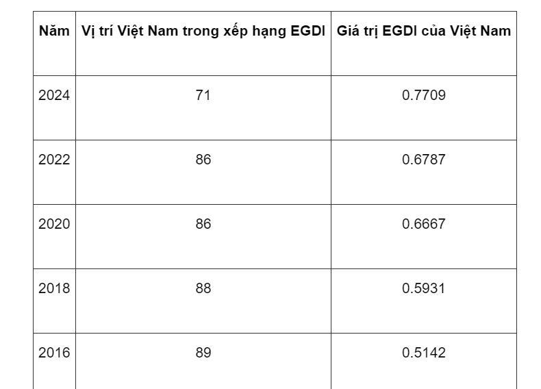 Trong bảng xếp hạng năm 2024, Việt Nam có vị trí thứ 71 trong 193 quốc gia thành viên LHQ, tăng 15 bậc so với năm 2022. Với kết quả này, Việt Nam lần đầu tiên được xếp vào nhóm EGDI ở mức Rất cao và vươn lên vị trí xếp hạng cao nhất kể từ khi bắt đầu tham gia đánh giá EGDI của LHQ vào năm 2003.