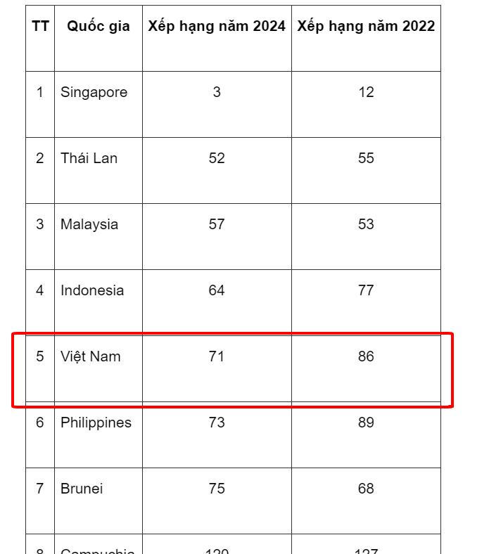 Trong khu vực Đông Nam Á, Việt Nam đã vượt Brunei để vươn lên vị trí thứ 5 trong 11 nước (tăng 1 bậc so với năm 2022); 4 nước có vị trí cao hơn Việt Nam là Singapore, Thái Lan, Malaysia và Indonesia. Đáng chú ý là Singapore tăng 9 bậc và vươn lên xếp thứ 3 trên toàn thế giới; Philippines tăng 16 bậc; Việt Nam tăng 15 bậc; Indonesia tăng 13 bậc; Đông Timor giảm 12 bậc.
