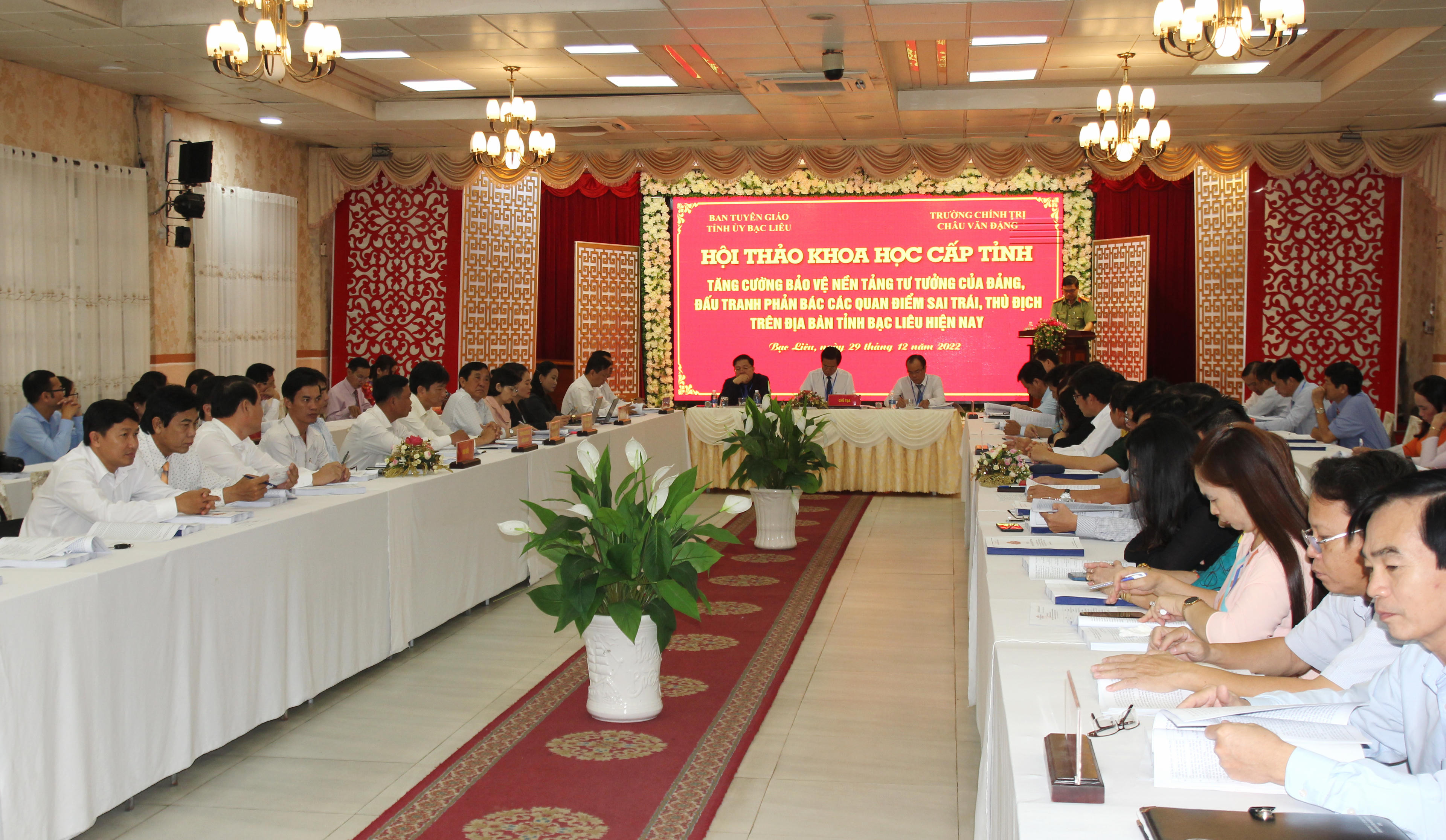 (PLVN) - Ban Tuyên giáo Tỉnh ủy Bạc Liêu phối hợp Trường Chính trị Châu Văn Đặng (tỉnh Bạc Liêu) mới tổ chức Hội thảo khoa học (HTKH) cấp tỉnh năm 2022 với chủ đề “Tăng cường bảo vệ nền tảng tư tưởng của Đảng, đấu tranh phản bác các quan điểm sai trái, thù địch trên địa bàn tỉnh hiện nay”.