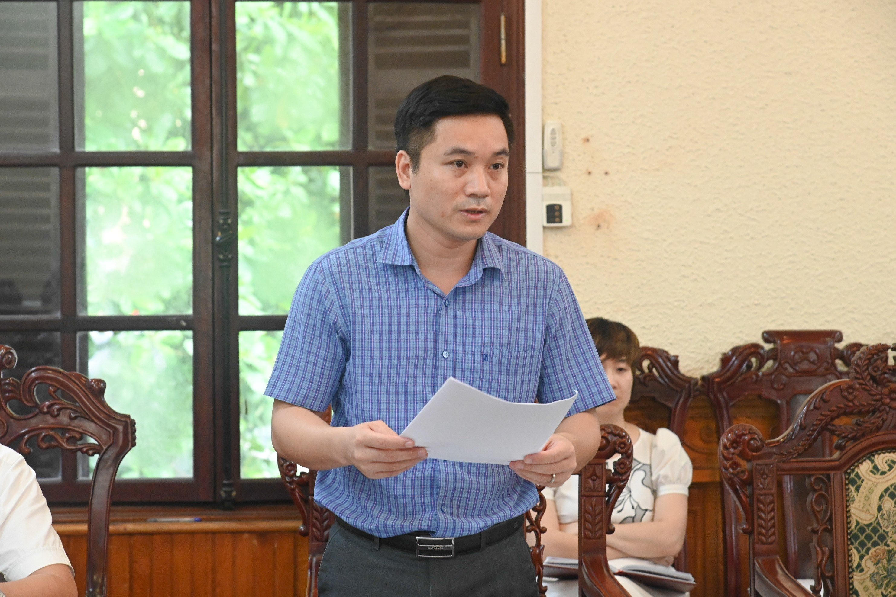 Vụ trưởng Vụ Hợp tác quốc tế Nguyễn Hữu Huyên khái quát một số thông tin tại cuộc họp. |