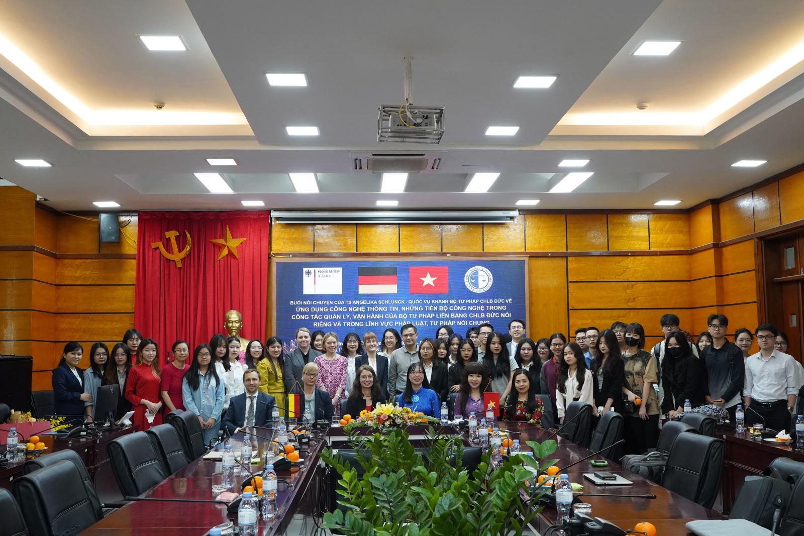 Sau buổi làm việc với lãnh đạo Nhà trường, bà Quốc vụ khanh Angelika Schlunck đã có buổi nói chuyện với giảng viên, sinh viên để chia sẻ về “Ứng dụng công nghệ thông tin, những tiến bộ công nghệ trong công tác quản lý, vận hành của Bộ Tư pháp liên bang CHLB Đức nói riêng và trong lĩnh vực pháp luật, tư pháp nói chung”.