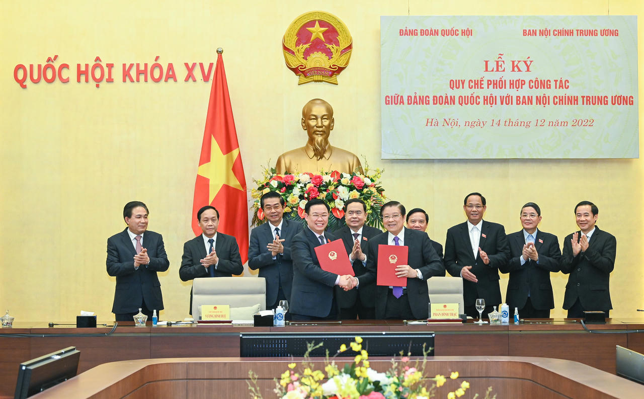 Chiều 14/12, tại Nhà Quốc hội, Ủy viên Bộ Chính trị, Bí thư Đảng đoàn Quốc hội, Chủ tịch Quốc hội Vương Đình Huệ và Ủy viên Bộ Chính trị, Bí thư Trung ương Đảng, Trưởng Ban Nội chính Trung ương Phan Đình Trạc đã chủ trì Lễ ký Quy chế phối hợp công tác giữa Đảng đoàn Quốc hội và Ban Nội chính Trung ương.