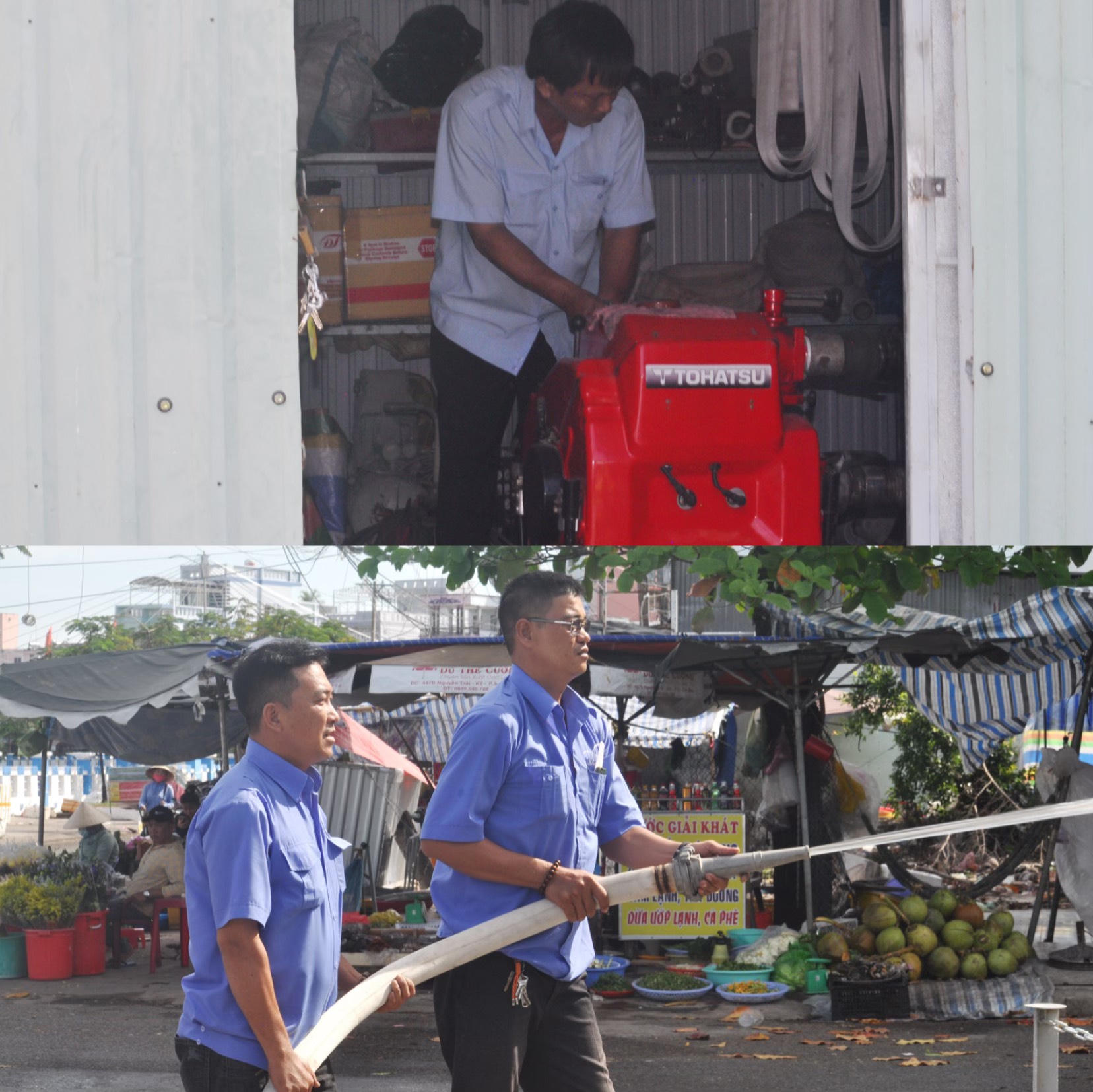 Đội bảo vệ chợ kiểm tra định kỳ hệ thống máy bơm PCCC tại chợ Bách hóa Cà Mau. |
