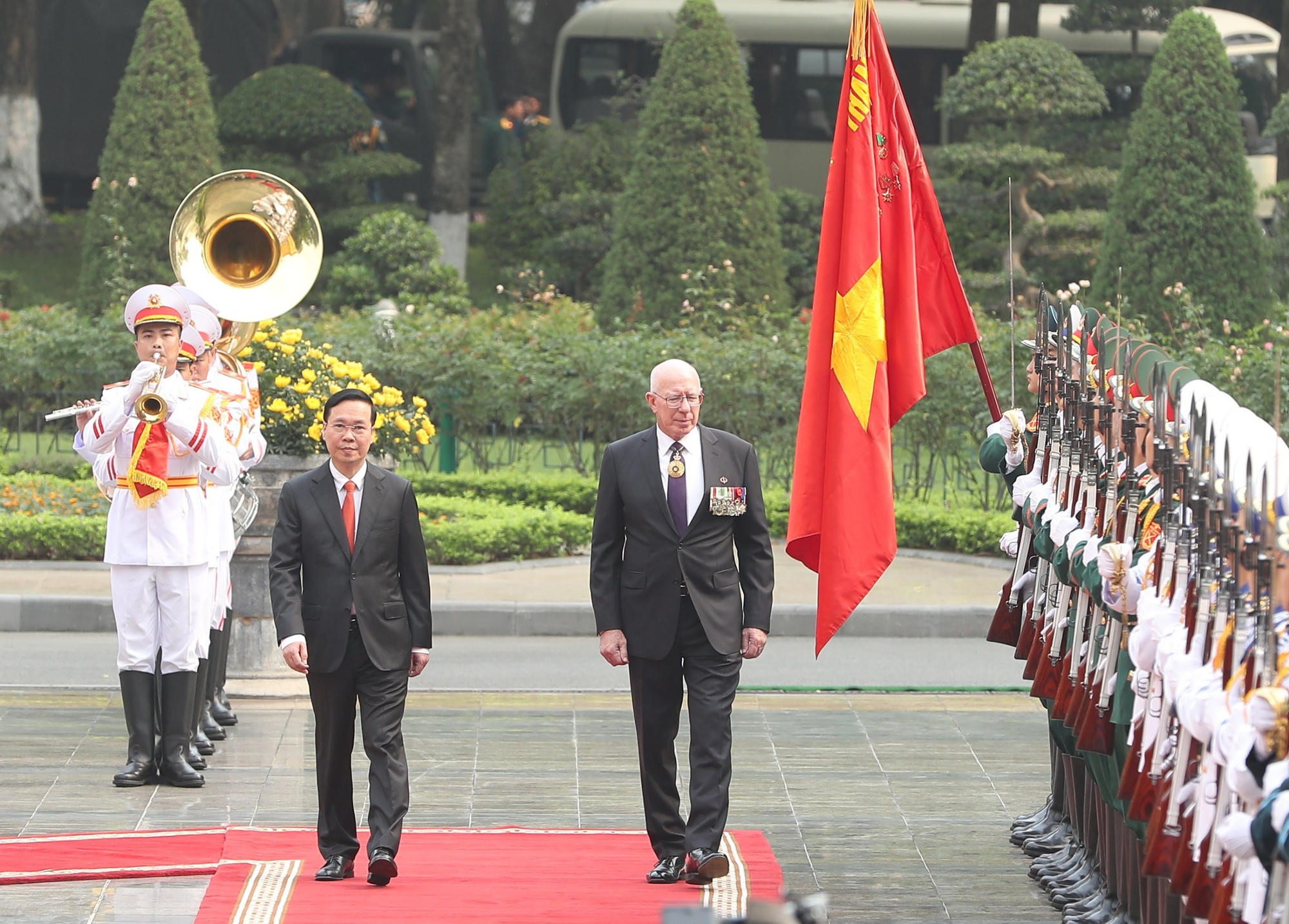 Chủ tịch nước Võ Văn Thưởng và Phu nhân chủ trì Lễ đón chính thức Toàn quyền Australia David Hurley cùng Phu nhân thăm cấp Nhà nước tới Việt Nam. Ảnh: VGP |