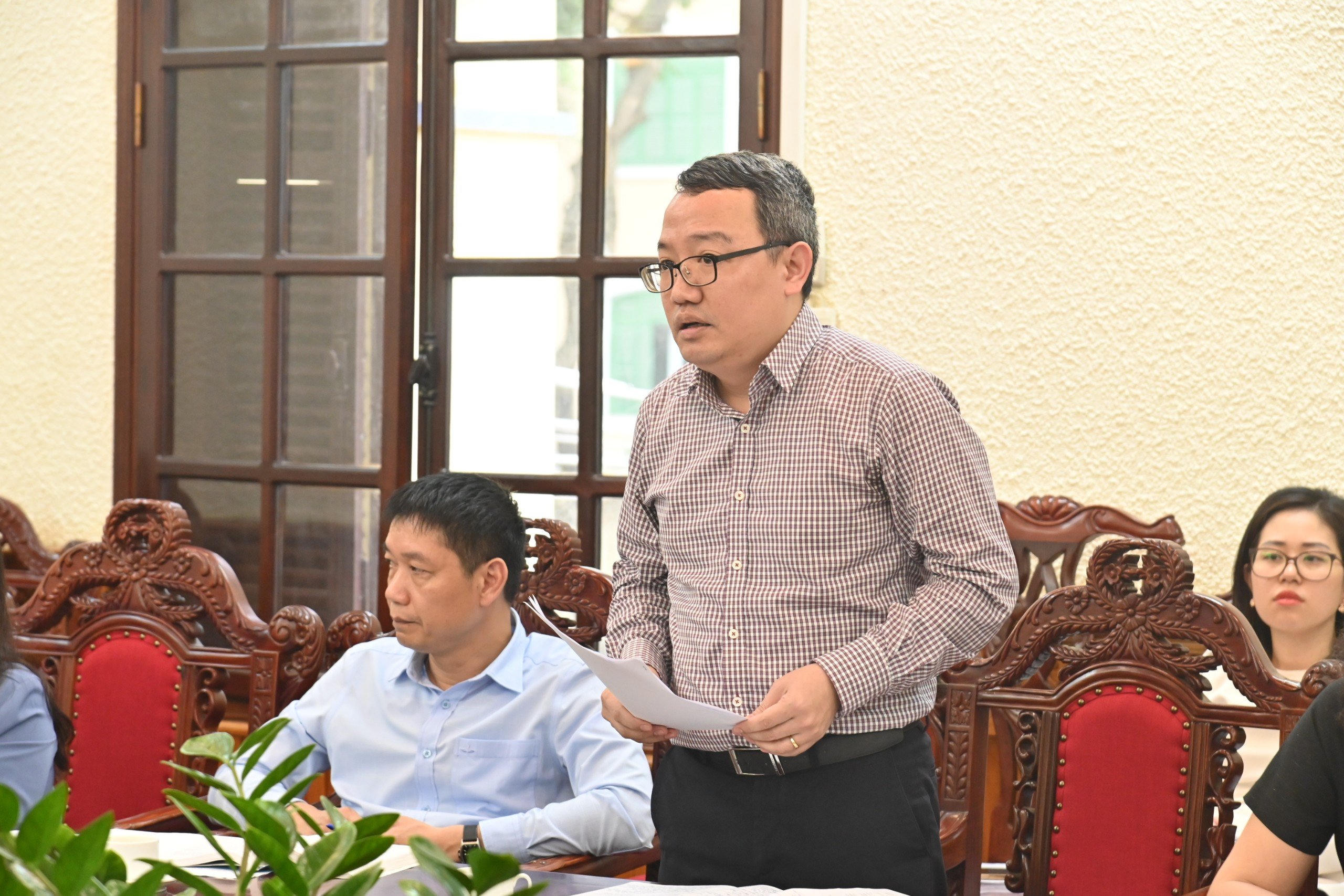 Phó Vụ trưởng phụ trách Vụ Các vấn đề chung về xây dựng pháp luật Trần Anh Đức báo cáo tại cuộc họp. |