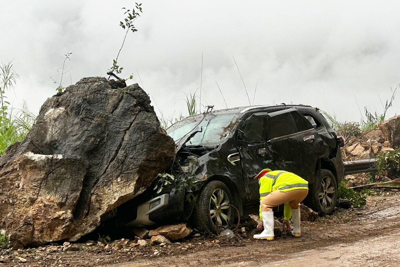 Tảng đá lăn trên cao xuống đè trúng ô tô đang di chuyển ở Hòa Bình