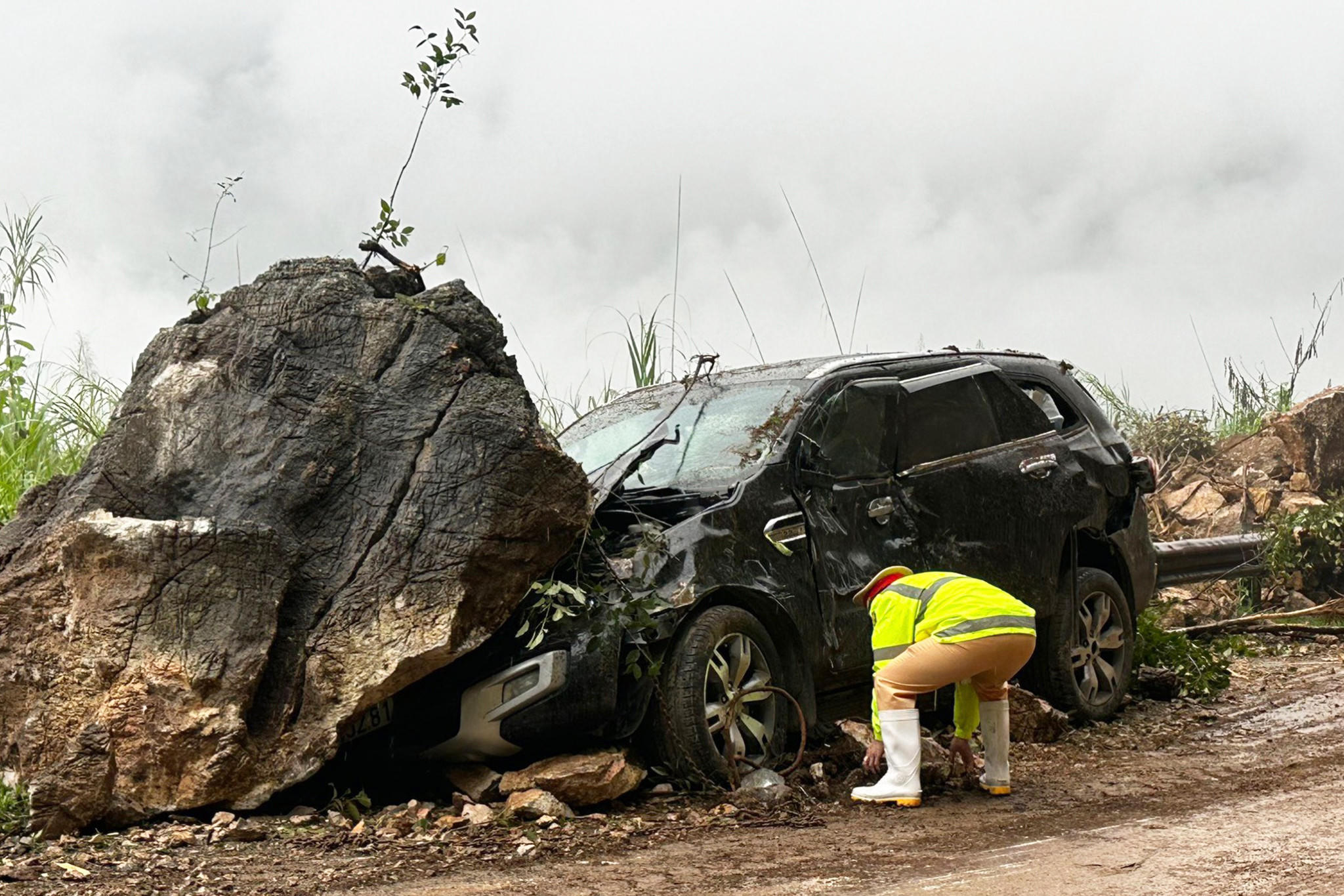 Tại hiện trường, phần đầu ô tô bị đá đè biến dạng, kính sau vỡ và xe bị đẩy sát vào dải hộ lan ven đường.