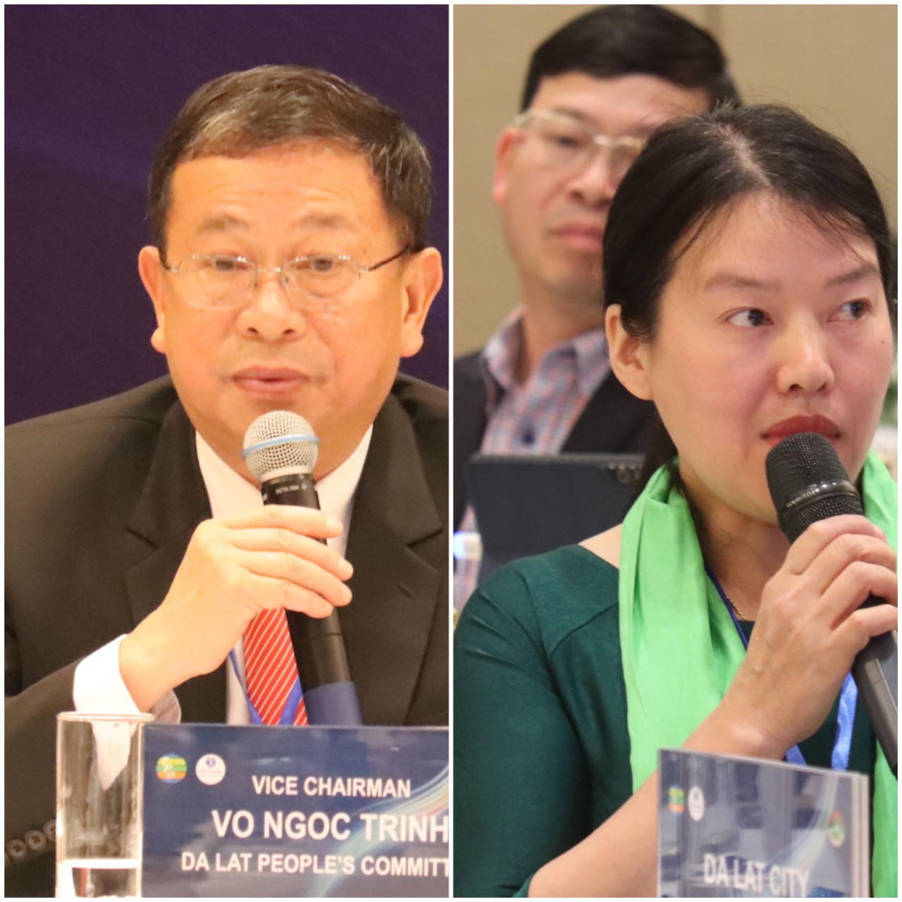 Các Phó Chủ tịch TP Đà Lạt Võ Ngọc Trình, Trần Thị Vũ Loan trình bày tham luận, ý kiến tại Hội nghị. |