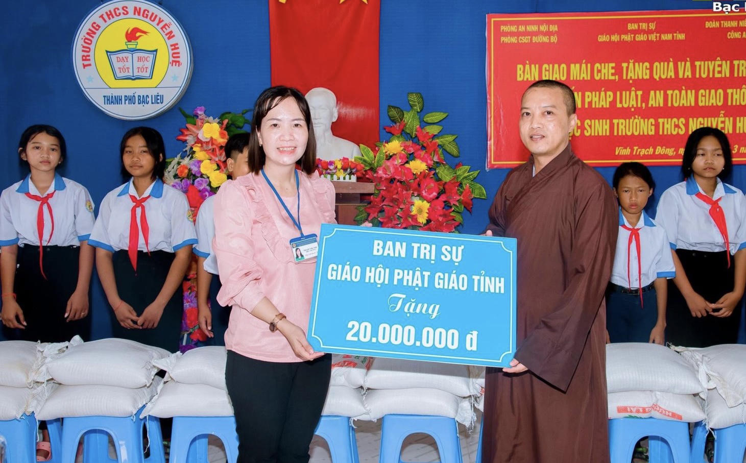 (PLVN) - Nằm trong chuỗi các hoạt động kỷ niệm 75 năm Ngày Chủ tịch Hồ Chí Minh có Sáu điều dạy CAND (11/3/1948 – 11/3/2023), Phòng An ninh nội địa phối hợp với Phòng Cảnh sát giao thông đường bộ Công an tỉnh Bạc Liêu và Ban Trị sự Giáo hội Phật giáo Việt Nam tỉnh đã tổ chức tuyên truyền pháp luật và tặng quà cho các em học sinh có hoàn cảnh khó khăn của Trường THCS Nguyễn Huệ, ấp Biển Tây A, xã Vĩnh Trạch Đông, thành phố Bạc Liêu.