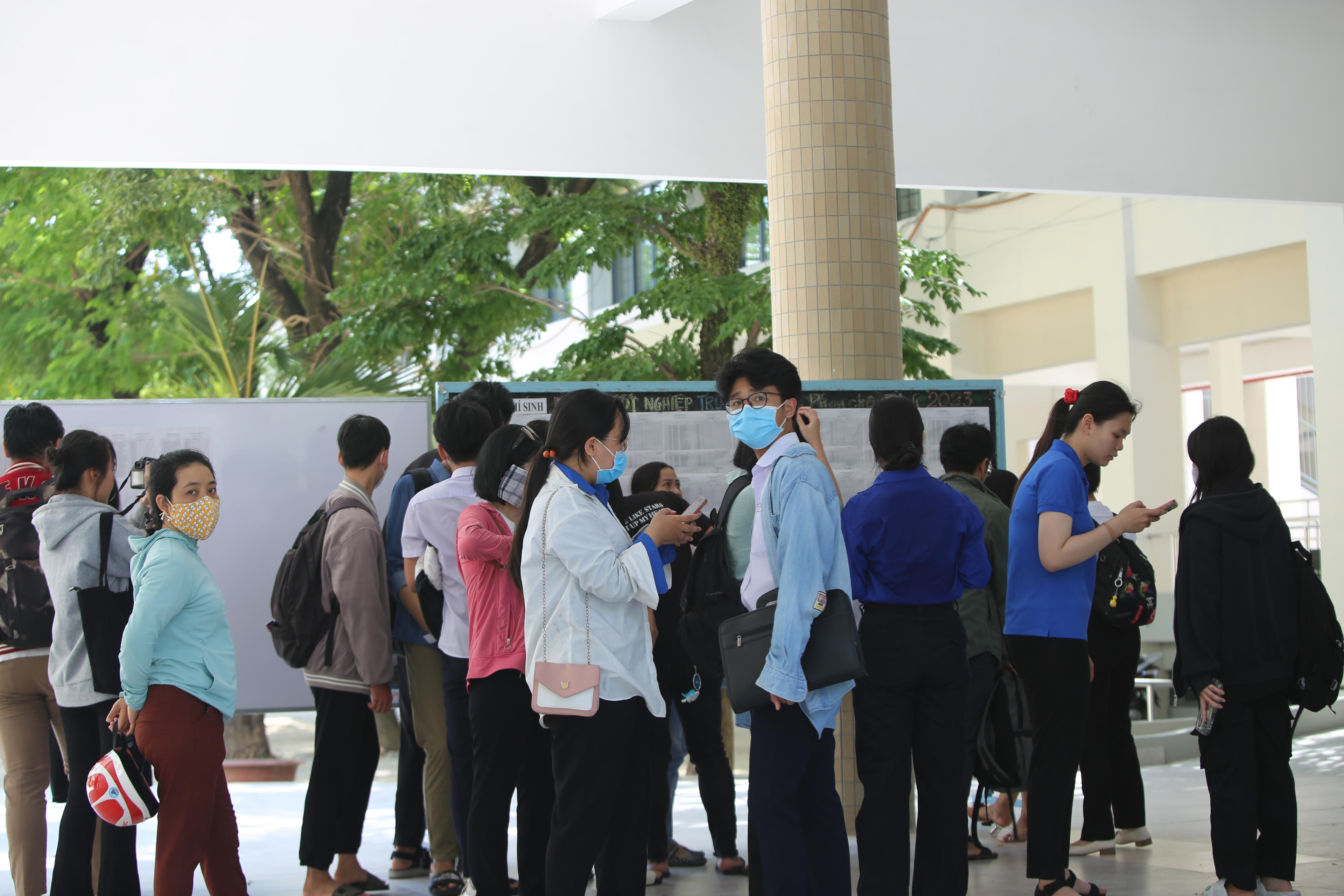 Các thí sinh xem thông tin của mình được dán ở điểm thi trường THPT Phan Châu Trinh (Đà Nẵng). |