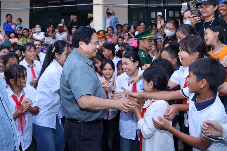 Thủ tướng Phạm Minh Chính và các em học sinh tại lễ khởi công trường nội trú liên cấp tiểu học – trung học cơ sở tại xã miền núi Bát Mọt, cách trung tâm tỉnh Thanh Hóa khoảng 120 km về phía tây - Ảnh: VGP/Nhật Bắc