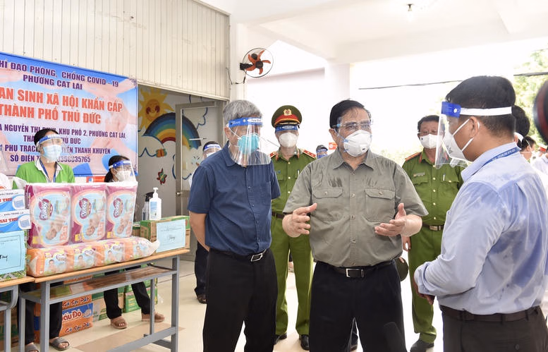 Ngày 26/8/2021, Thủ tướng Phạm Minh Chính thị sát công tác phòng chống dịch, thăm hỏi, động viên người dân trong vùng cách ly phong tỏa, ở TP. Thủ Đức, TPHCM những ngày "chống dịch như chống giặc" - Ảnh: VGP