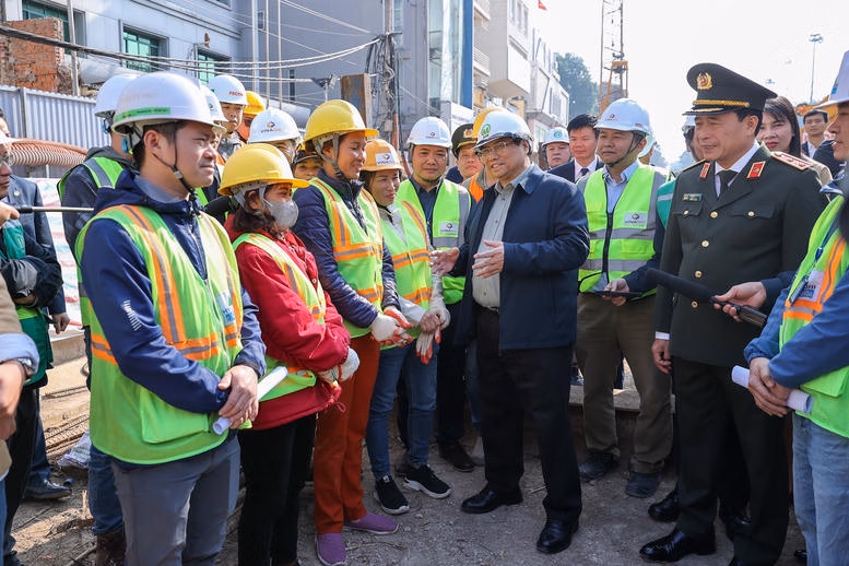 Thủ tướng Phạm Minh Chính kiểm tra, đôn đốc, thúc đẩy tiến độ dự án đường bộ cao tốc Đồng Đăng (Lạng Sơn) - Trà Lĩnh (Cao Bằng) và trò chuyện cùng người lao động tại công trường - Ảnh: VGP/Nhật Bắc