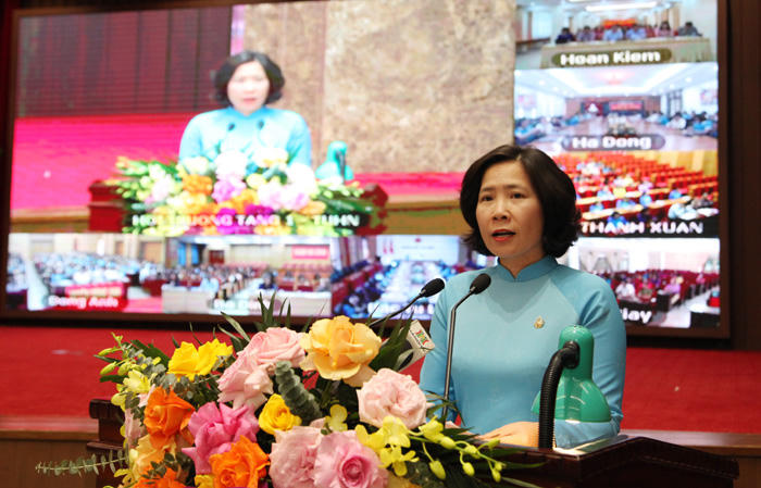 Báo cáo tại hội nghị, Chủ tịch hội Liên hiệp Phụ nữ TP Hà Nội Lê Kim Anh cho biết, Hội Liên hiệp Phụ nữ TP đã phát động và tổ chức triển khai có hiệu quả phong trào thi đua Xây dựng người phụ nữ Thủ đô “Trung hậu - Sáng tạo - Đảm đang - Thanh lịch”, cuộc vận động Xây dựng gia đình “5 không, 3 sạch”, “Phụ nữ Thủ đô ứng xử đẹp”, hỗ trợ phụ nữ khởi nghiệp, phát triển kinh tế, giảm nghèo bền vững.