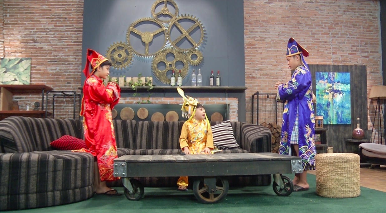 Tập đặc biệt ngập tràn không khí Tết với bối cảnh cành mai nở rộ còn ba cậu con trai “siêu quậy” Đinh - Ốc – Vít (Gia Lộc, Bảo Bảo, An Khang) cũng hớn hở mặc những chiếc áo dài truyền thống đầy màu sắc và đóng kịch Táo Quân về trời.
