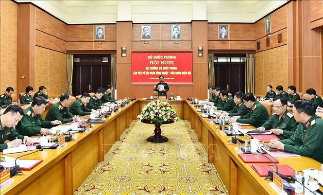 Đại tướng Phan Văn Giang, Ủy viên Bộ Chính trị, Phó bí thư Quân ủy Trung ương, Bộ trưởng Bộ Quốc phòng phát biểu tại Hội nghị. Ảnh: TTXVN phát