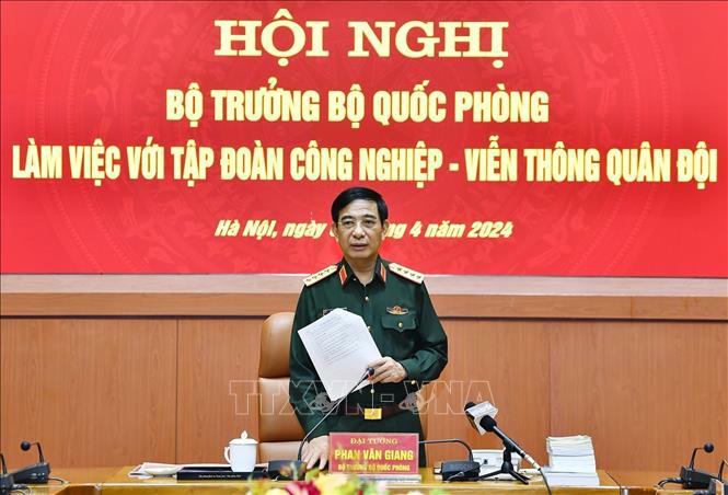 (PLVN) - Sáng 2/4, tại Hà Nội, Đại tướng Phan Văn Giang, Ủy viên Bộ Chính trị, Phó bí thư Quân ủy Trung ương, Bộ trưởng Bộ Quốc phòng chủ trì Hội nghị Bộ trưởng Bộ Quốc phòng làm việc với Tập đoàn Công nghiệp - Viễn thông Quân đội (Viettel).