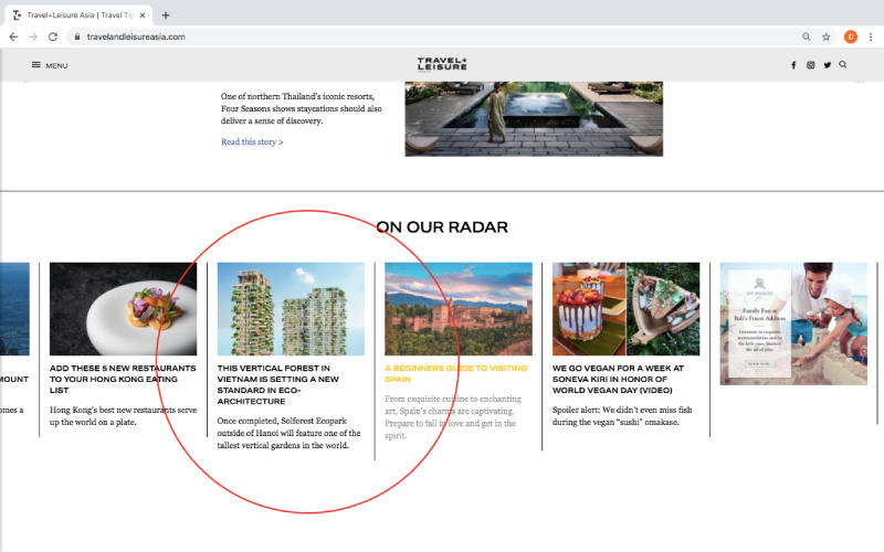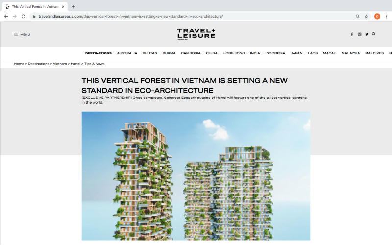 Vào chiều ngày 11/11, Travel & Leisure đã dành hẳn một vị trí nổi bật trên trang chủ của tạp chí để viết về Sol Forest – Dự án xanh biểu tượng của Ecopark đang gây sốt tại thị trường Việt Nam. Dự án này gây ấn tượng với 2 toà tháp xanh cao gần 200 m, được phát triển theo mô hình rừng thẳng đứng (Vertical Forest) với 400 khu vườn nhiệt đới trên cao.