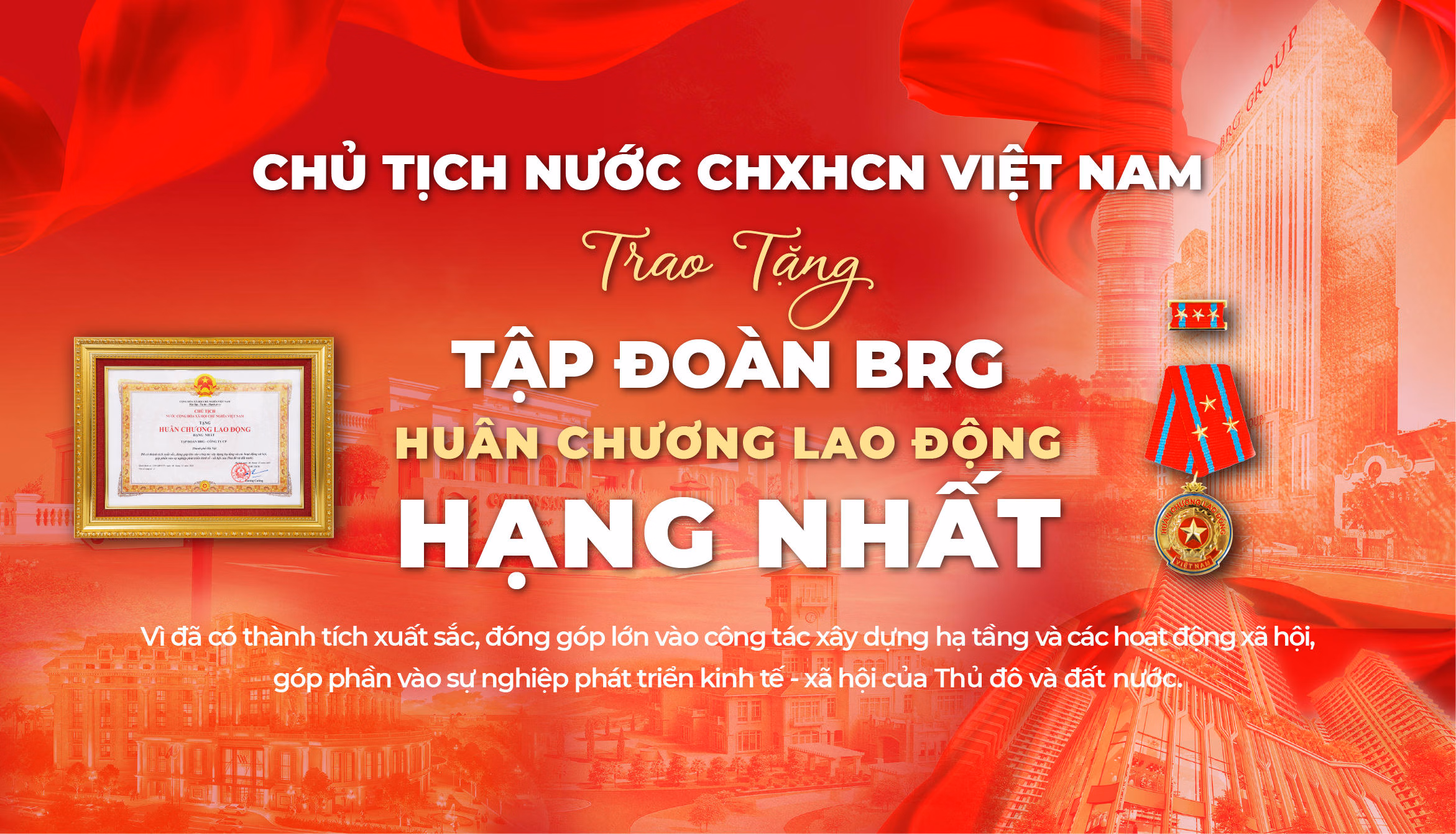 Năm 2025, Tập đoàn BRG đã xác lập một giai đoạn phát triển đầy tự hào với những phần thưởng cao quý được Lãnh đạo Đảng và Nhà nước ghi nhận như: Huân chương Lao động hạng Nhất, Cờ Thi đua Chính phủ, 03 Bằng khen của Thủ tướng Chính phủ, Bằng khen của Ban Tuyên giáo và Ban Dân vận Trung ương và Bằng khen vì An ninh Tổ Quốc... Những phần thưởng này không chỉ ghi nhận hiệu quả hoạt động sản xuất kinh doanh, mà còn khẳng định vị thế của BRG là doanh nghiệp tiên phong, đồng hành cùng tiến trình đổi mới, hiện đại hóa, phát triển bền vững của đất nước và có nhiều cống hiến trong các hoạt động an sinh, xã hội vì cộng đồng.