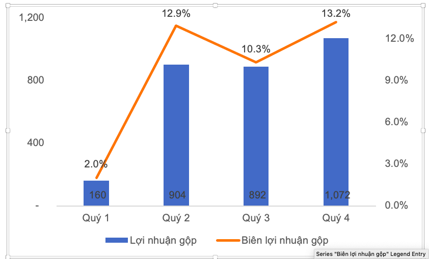 Biểu đồ diễn biến lợi nhuận gộp (tỷ đồng) và biên lợi nhuận gộp (%) của HSG trong NĐTC 2022-2023. |