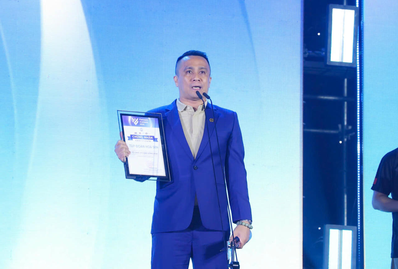 | Ông Trần Đình Tài - Phó Tổng Giám đốc Tập đoàn Hoa Sen (trái) nhận giải thưởng hạng mục "Tổ chức vì cộng đồng" Vietnam iContent Awards 2024. |