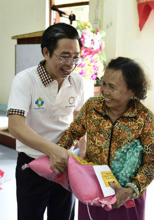 | Ông Hồ Thanh Hiếu - PTGĐ Tập đoàn Hoa Sen đang trao quà cho người dân của xã Ân Đức, huyện Hoài Ân, Bình Định tại đợt lũ tháng 11 vừa qua |