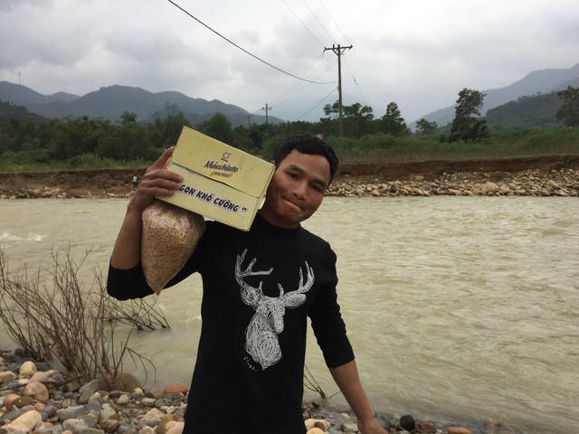 Con đường từ xã Hướng Hiệp vào bản Đá Ngồi bị nước lũ cuốn phăng chiếc cầu nên người dân phải căng dây hai bên đầu sông rồi băng suối sang bên kia nhận hàng cứu trợ.