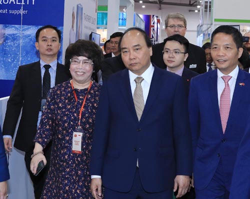Thủ tướng thăm các gian hàng Việt Nam tại Hội chợ Food and Hotel Asia. |