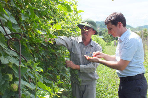 Chuyên gia dược liệu TH kiểm tra sinh trưởng của cây lạc tiên trồng theo tiêu chuẩn organic Châu Âu và Mỹ tại trang trại dược liệu ở huyện Yên Thành (Nghệ An).