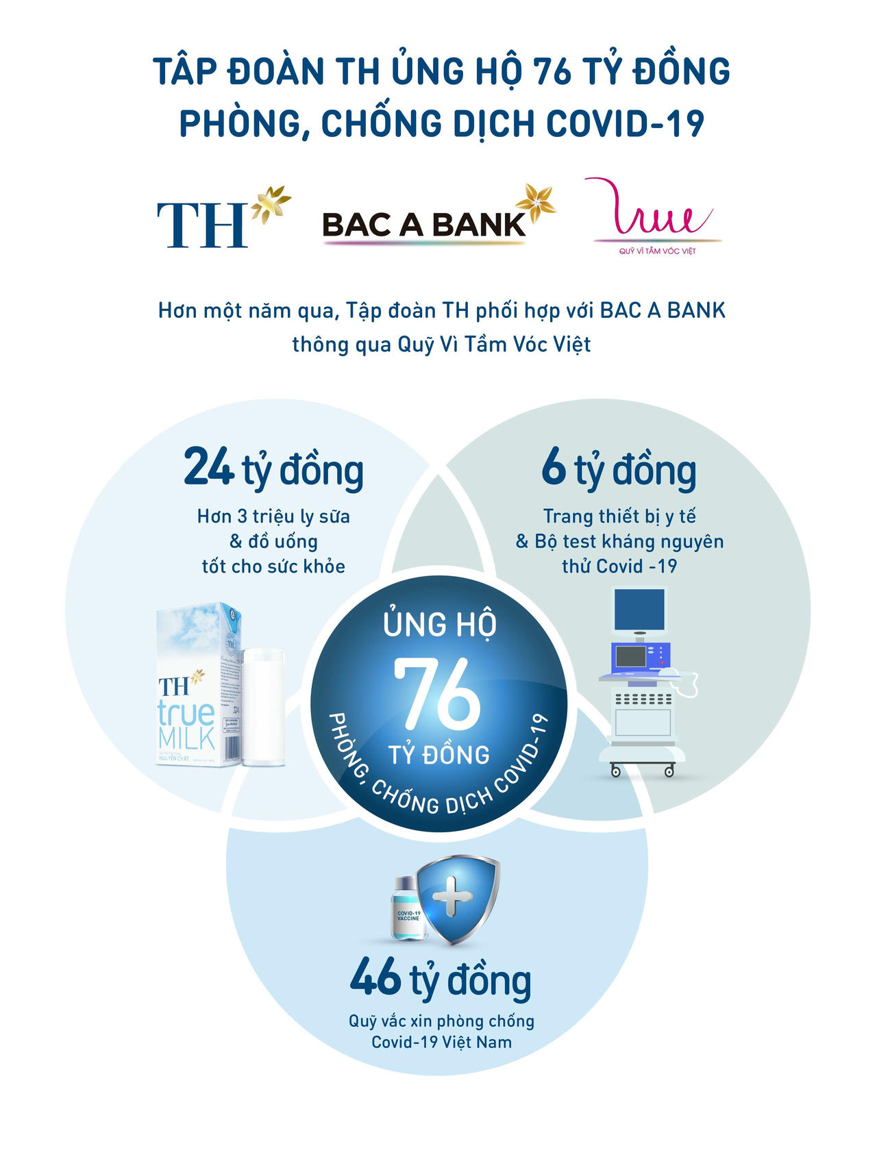 Từ khi dịch Covid-19 bùng phát vào đầu năm 2020 tới nay, TH đã chung tay đóng góp kịp thời hơn 76 tỷ đồng cùng cả nước đẩy lùi dịch bệnh: trong đó,đóng góp 46 tỷ đồng vào Quỹ vắc-xin phòng chống Covid-19 và trao tặng đến tuyến đầu, người dân hơn 3 triệu sản phẩm sữa tươi sạch, đồ uống tốt cho sức khỏe, tăng đề kháng, cùng các vật tư y tế khác như máy thở, khẩu trang,..trị giá hơn 30 tỷ đồng.
