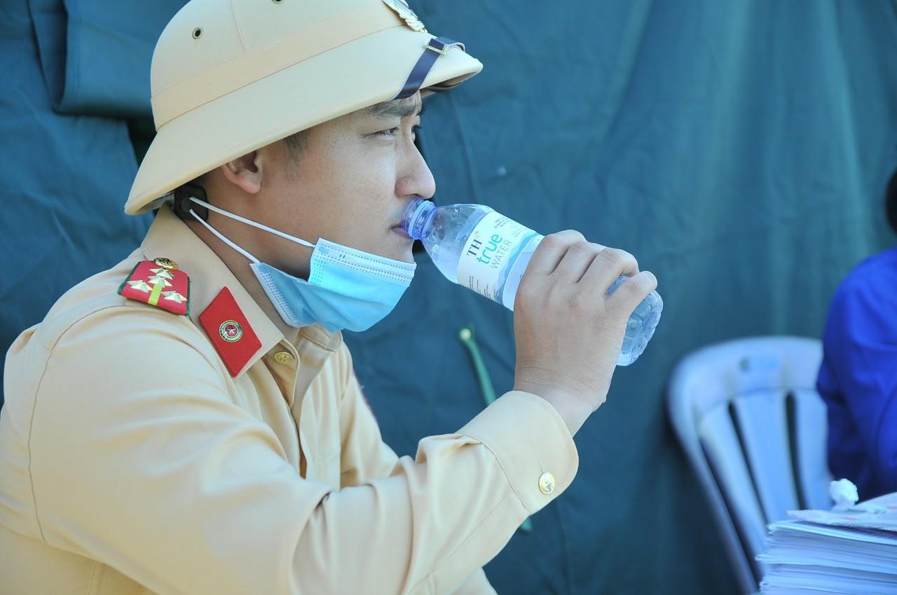 Phút nghỉ ngơi giữa trưa nắng gắt của chiến sĩ cảnh sát giao thông tại một chốt phong tỏa phòng chống dịch trên đại bàn tỉnh Nghệ An. |