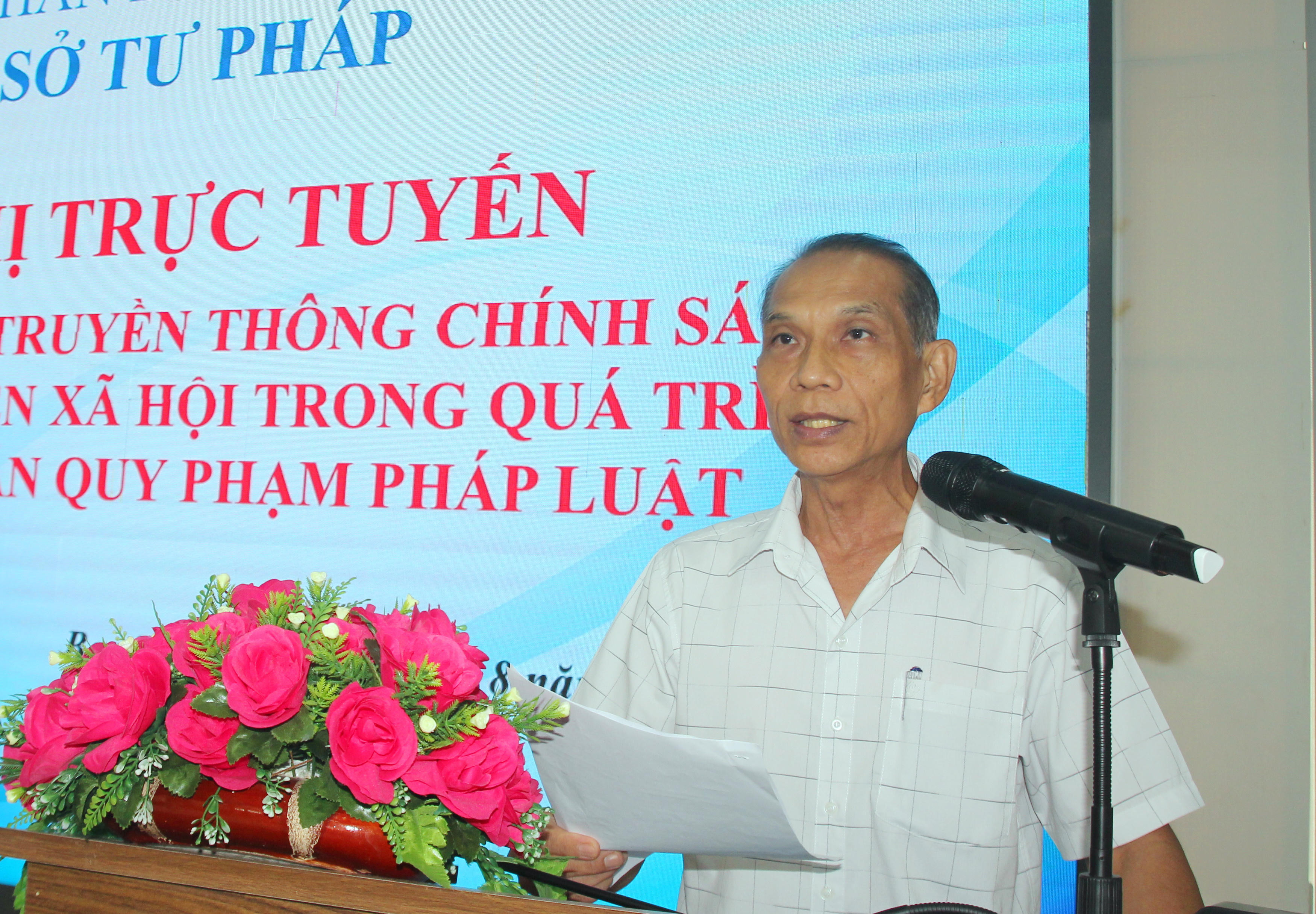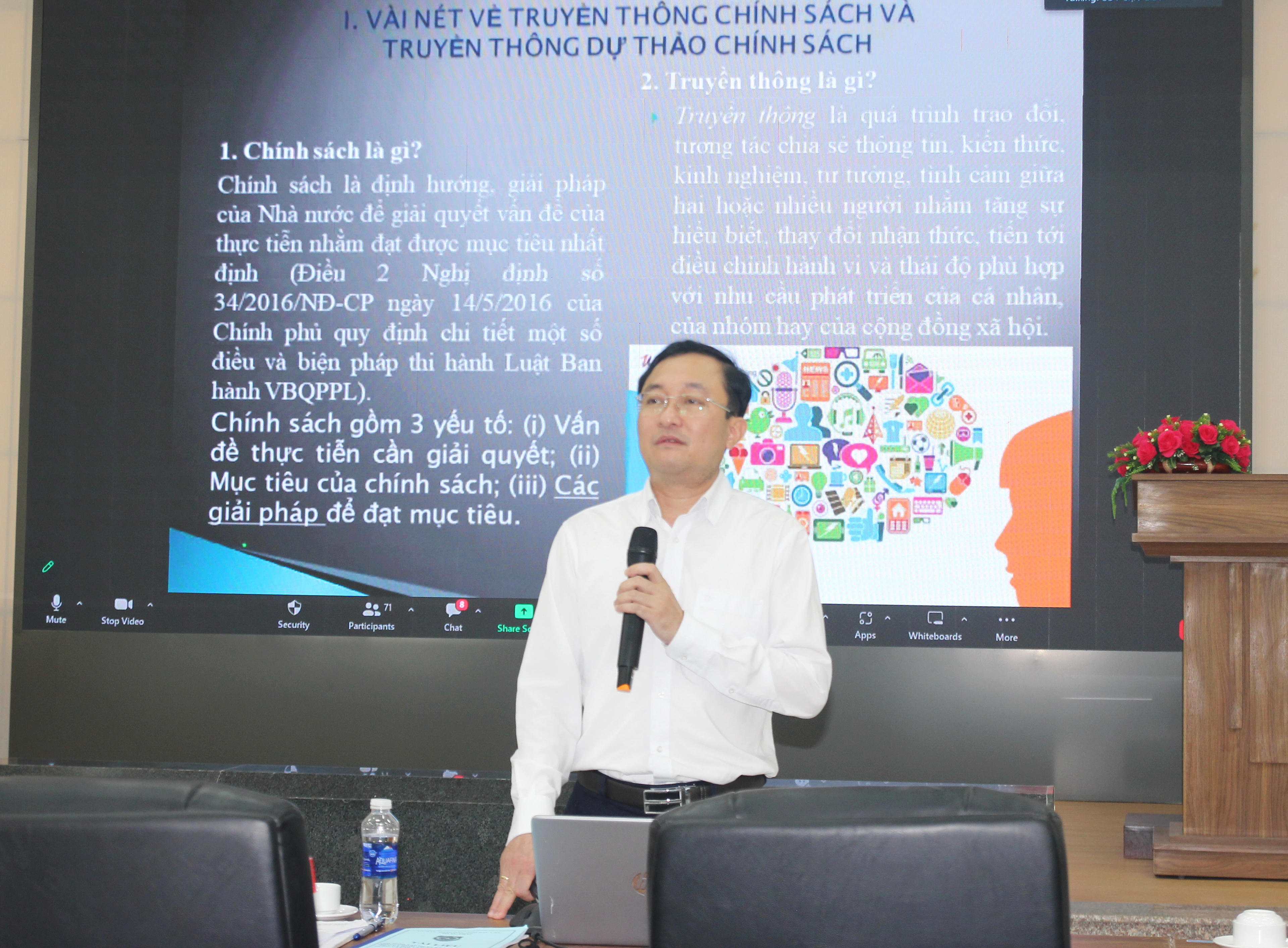 Tại Hội nghị tập huấn, Báo cáo viên Phan Hồng Nguyên - Phó Cục trưởng Cục Phổ biến, giáo dục pháp luật (Bộ Tư pháp), đã triển khai một số nội dung cơ bản của 04 Chuyên đề do Bộ Tư pháp chủ trì soạn thảo: Những vấn đề chung về truyền thông chính sách có tác động lớn đến xã hội trong quá trình xây dựng văn bản quy phạm pháp luật; Kỹ năng xây dựng kế hoạch tổ chức truyền thông dự thảo chính sách; Kỹ năng tích hợp, đăng tải, khai thác thông tin nội dung dự thảo chính sách và những vấn đề liên quan trên Cổng thông tin điện tử Phổ biến, giáo dục pháp luật quốc gia, các phần mềm về phổ biển, giáo dục pháp luật; Kỹ năng cung cấp thông tin, tiếp nhận, xử lý thông tin góp ý và phản hồi ý kiến góp ý đối với dự thảo chính sách, Giới thiệu một số hình thức truyền thông dự thảo chính sách, văn bản quy phạm pháp luật.