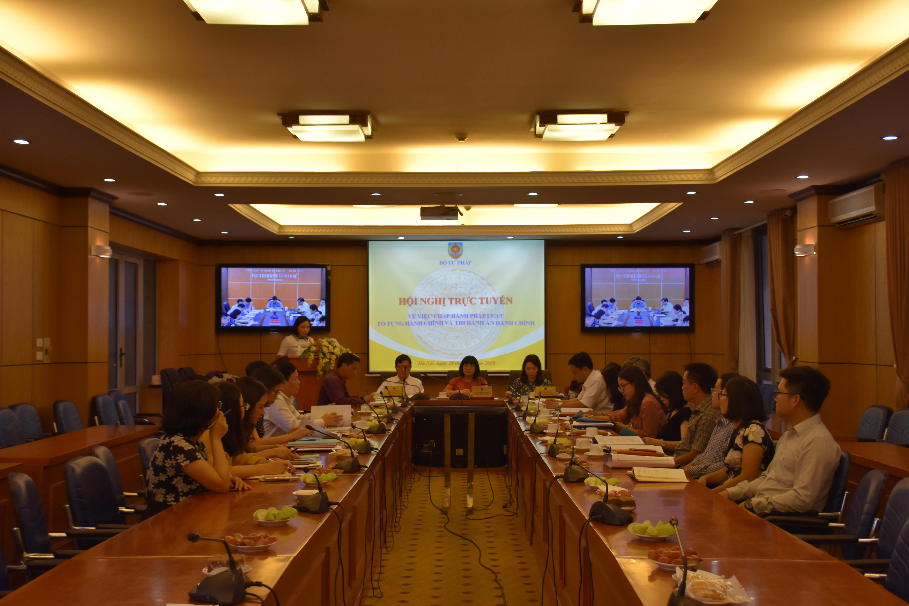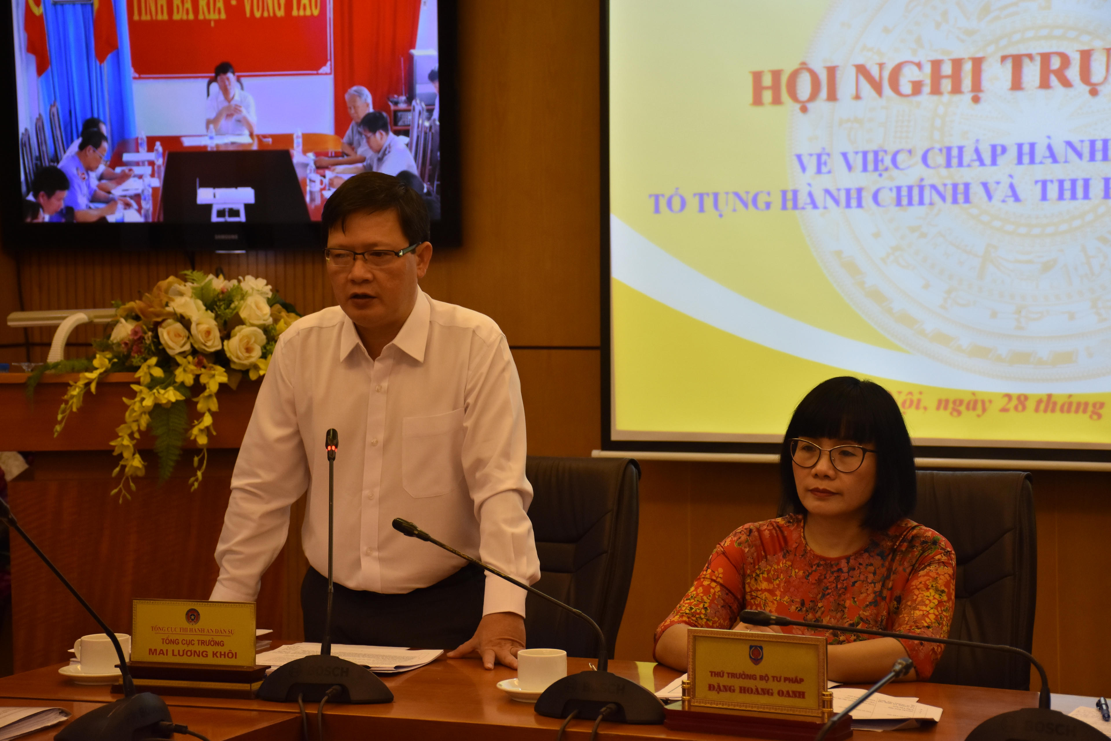 Thứ trưởng Bộ Tư pháp Đặng Hoàng Oanh, Tổng cục trưởng Tổng cục THADS Mai Lương Khôi, Phó Tổng cục trưởng Trần Thị Phương Hoa đồng chủ trì Hội nghị. Tham dự còn có đại diện một số Bộ, ngành ở TW; Chủ tịch, Phó Chủ tịch UBND tỉnh tại 19 điểm cầu địa phương.