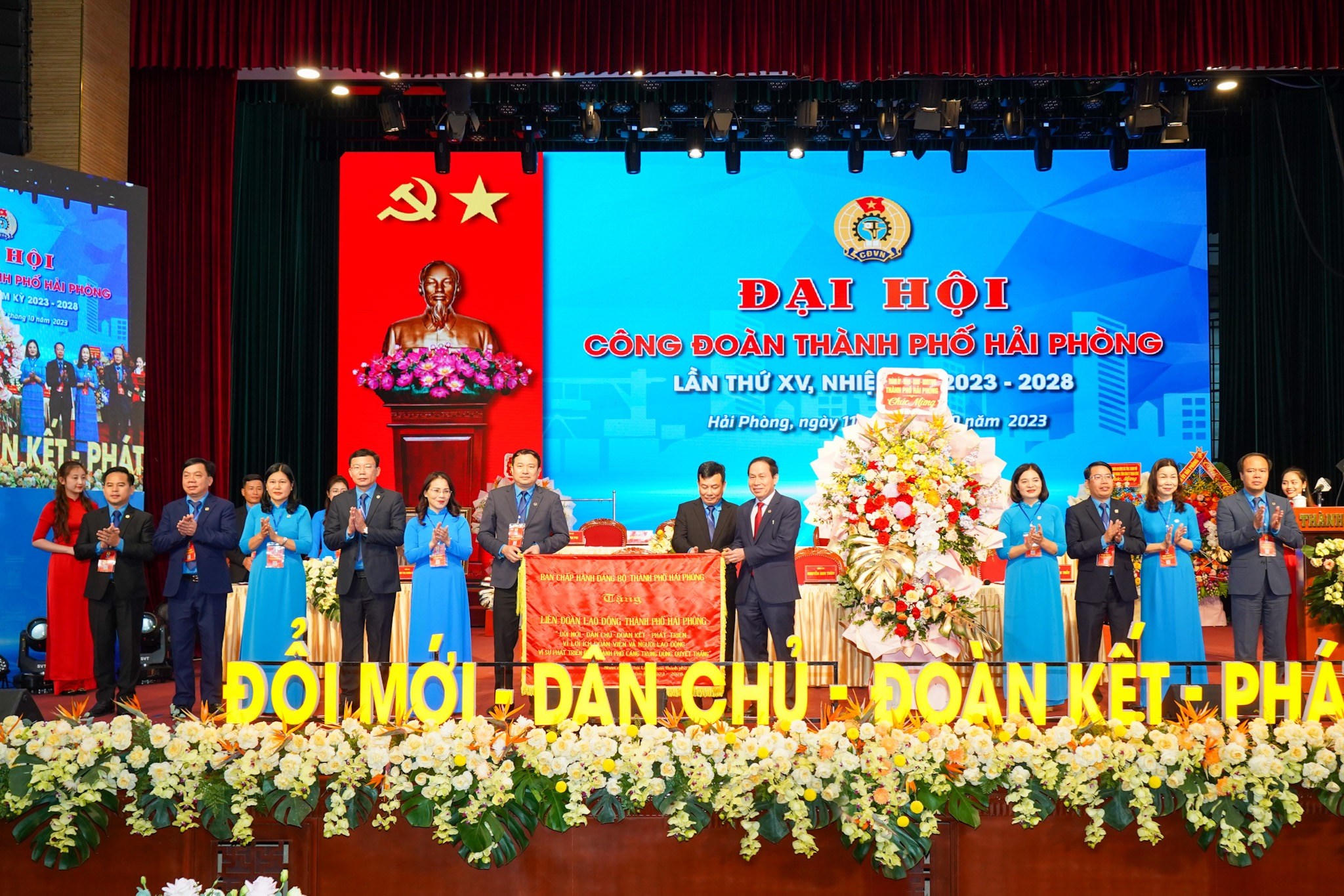 Chủ tịch Tổng LĐLĐ Việt Nam Nguyễn Đình Khang và Bí thư Thành ủy Hải Phòng Lê Tiến Châu ghi nhận, biểu dương và chúc mừng những kết quả, thành tích của các cấp công đoàn TP Hải Phòng đã đạt được trong nhiệm kỳ vừa qua. Chủ tịch Tổng LĐLĐ Việt Nam và Bí thư Thành ủy Hải Phòng mong muốn đội ngũ công nhân viên chức lao động TP phải quyết tâm cao để khắc phục mọi khó khăn, không ngừng phấn đấu vì việc làm bền vững và cuộc sống tốt đẹp của bản thân, vì sự ổn định và phát triển của doanh nghiệp, đóng góp vào công cuộc xây dựng TP.